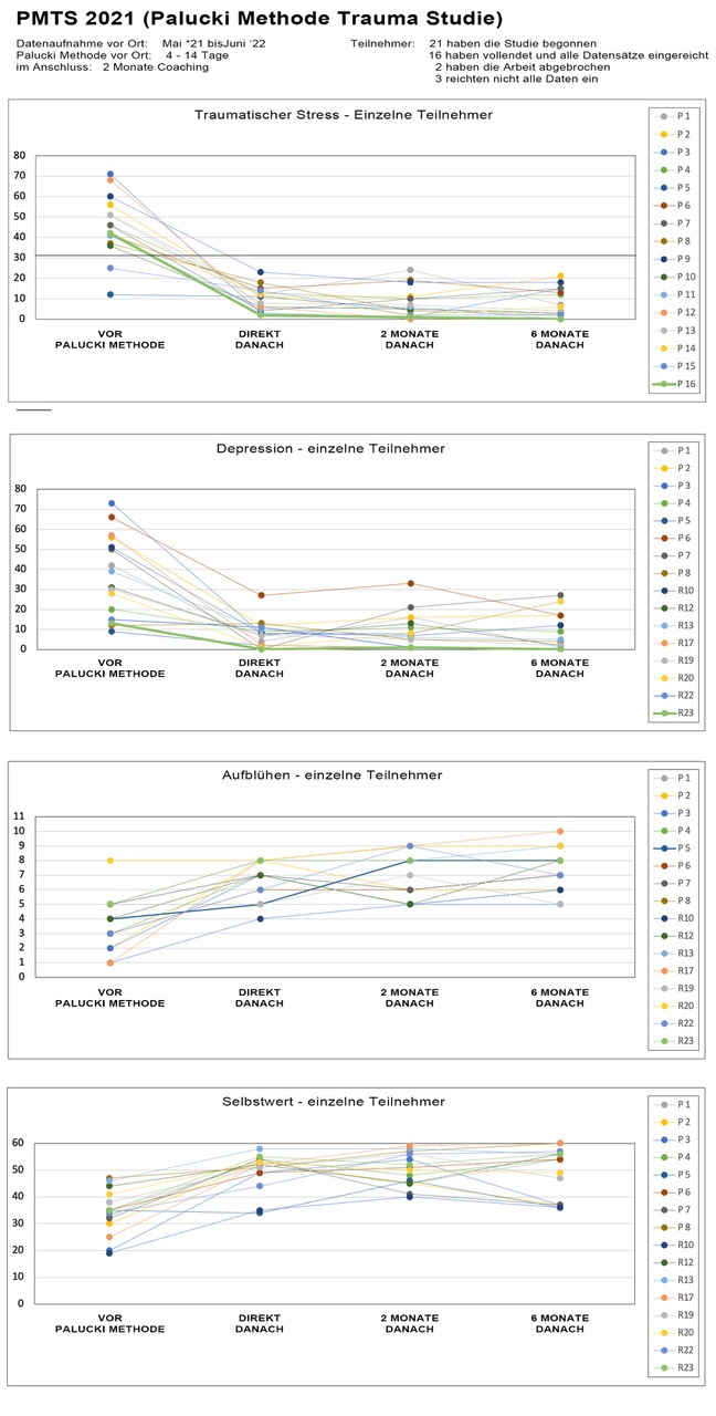 Es gibt kontinuierliche Forschung zu allen Aspekten der Palucki-Methode. Die Abbildungen rechts zeigen die Ergebnisse der 16 Teilnehmer unserer Studie PMTS2021 (vorläufig), bei der die Teilnehmer 4-15 Tage vor Ort verbringen (Durchschnitt 10 Tage).